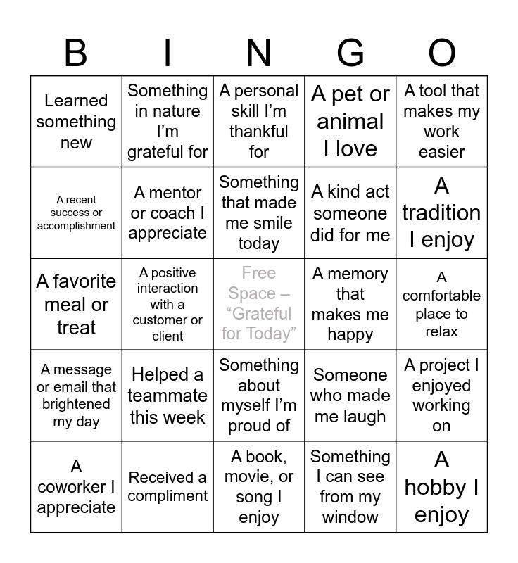 This bingo card has a free space and 24 words: Helped a teammate this week, Received a compliment, Something that made me smile today, A coworker I appreciate, A tool that makes my work easier, Learned something new, A recent success or accomplishment, Something in nature I’m grateful for, A memory that makes me happy, Something about myself I’m proud of, A kind act someone did for me, A favorite meal or treat, Someone who made me laugh, A project I enjoyed working on, A mentor or coach I appreciate, Something I can see from my window, A comfortable place to relax, A personal skill I’m thankful for, A tradition I enjoy, A positive interaction with a customer or client, A hobby I enjoy, A message or email that brightened my day, A pet or animal I love and A book, movie, or song I enjoy.