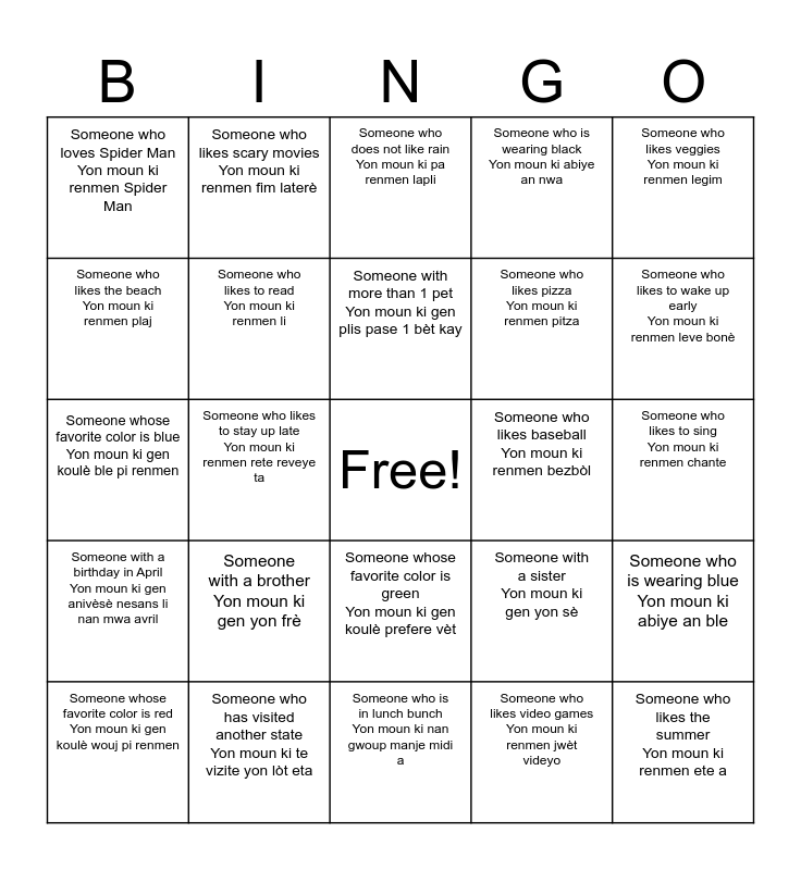 This bingo card has a free space and 24 words: Someone with a brother Yon moun ki gen yon frè, Someone who has visited another state Yon moun ki te vizite yon lòt eta, Someone with more than 1 pet Yon moun ki gen plis pase 1 bèt kay, Someone whose favorite color is red Yon moun ki gen koulè wouj pi renmen, Someone who likes veggies Yon moun ki renmen legim, Someone who loves Spider Man Yon moun ki renmen Spider Man, Someone who likes the beach Yon moun ki renmen plaj, Someone who likes scary movies Yon moun ki renmen fim laterè, Someone who likes baseball Yon moun ki renmen bezbòl, Someone whose favorite color is green Yon moun ki gen koulè prefere vèt, Someone who likes pizza Yon moun ki renmen pitza, Someone whose favorite color is blue Yon moun ki gen koulè ble pi renmen, Someone with a sister Yon moun ki gen yon sè, Someone who is wearing blue Yon moun ki abiye an ble, Someone who likes to read Yon moun ki renmen li, Someone who likes video games Yon moun ki renmen jwèt videyo, Someone who likes to sing Yon moun ki renmen chante, Someone who does not like rain Yon moun ki pa renmen lapli, Someone who likes to wake up early Yon moun ki renmen leve bonè, Someone who likes to stay up late Yon moun ki renmen rete reveye ta, Someone who likes the summer Yon moun ki renmen ete a, Someone with a birthday in April Yon moun ki gen anivèsè nesans li nan mwa avril, Someone who is wearing black Yon moun ki abiye an nwa and Someone who is in lunch bunch Yon moun ki nan gwoup manje midi a.