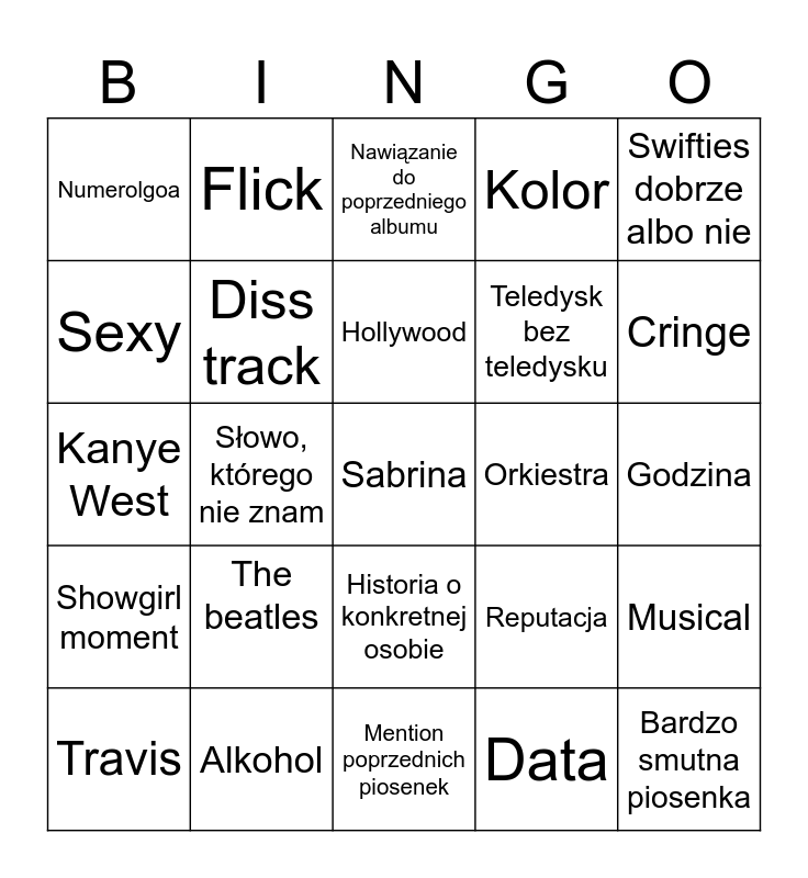 This bingo card has a free space and 24 words: The beatles, Alkohol, Hollywood, Travis, Swifties dobrze albo nie, Numerolgoa, Sexy, Flick, Orkiestra, Historia o konkretnej osobie, Teledysk bez teledysku, Kanye West, Reputacja, Musical, Diss track, Data, Godzina, Nawiązanie do poprzedniego albumu, Cringe, Słowo, którego nie znam, Bardzo smutna piosenka, Showgirl moment, Kolor and Mention poprzednich piosenek.