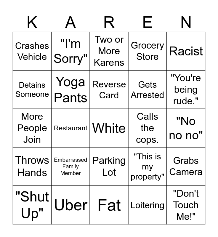This bingo card has a free space and 39 words: Entitled, Manager, Dyed Hair, Yoga Pants, "Shut Up", Parking Lot, Reverse Card, Male Karen, Racist, Throws Hands, Restaurant, Grocery Store, "Don't Touch Me!", "No no no", Calls the cops., Embarrassed Family Member, Has a Weapon, Crashes Vehicle, Threatens, "This is my property", Detains Someone, Fat, Gets Arrested, "You're being rude.", Crazy Eyes, Old Lady, Trips, Wrong Order, "Stop Recording", "I'm Sorry", Ignores Apology, Harasses Kids, Two or More Karens, Uber, Loitering, Starts Drama For No Reason, Grabs Camera, More People Join and Police Involved.