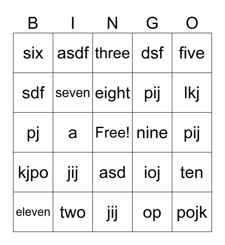 This bingo card has a free space and 29 words: one, two, three, four, five, six, seven, eight, nine, ten, eleven, a, op, pojk, pj, j;kl, jij, ioj, lkj, kjpo, jij, ij, pij, pij, sdf, asdf, asd, dsf and sd.