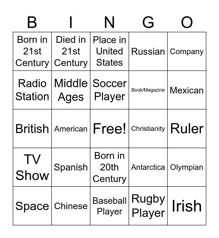 This bingo card has a free space and 99 words: Place in Poland, Place in Iran, Place in Russia, Place in United States, Place in United Kingdom, Place in India, Ancient, Born in 17th Century, Died in 17th Century, Born in 18th Century, Died in 18th Century, Born in 19th Century, Died in 19th Century, Born in 20th Century, Died in 20th Century, Born in 21st Century, Died in 21st Century, Politician, Author, Scientist, Celebrity, Actor, Musician, Military Personnel, Athlete, Olympian, Soccer Player, Basketball Player, Football Player, Hockey Player, Baseball Player, Rugby Player, Cricket Player, Sports Team/Season, American, British, Indian, Canadian, French, Spanish, Brazillian, Mexican, Russian, Chinese, Japanese, African, Middle Eastern, Australian/New Zealand, German, Italian, Korean, Irish, Antarctica, Scandinavian, South American, Fictional, Song, Album, Species, Chemistry, Highway/Road, Church/Historic Site, River/Lake, Mountain, Historic Event, Company, Military Division, Video Game, Movie, TV Show, Bollywood, Book/Magazine, Radio Station, Electoral District, Battle/War, Renaissance, Middle Ages, World War I, World War II, Cold War, Christianity, Islam, Judaism, Railroad/Metro, Still Living, Mathematics, Building, Businessmen, Ruler, Space, Vehicle, Surname, List, Place in Germany, Airline, Protein, Place in Australia/NZ, Place in Africa and Artist.