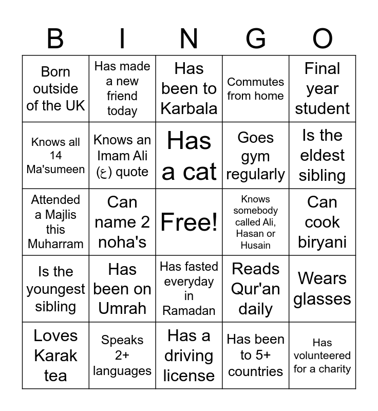 This bingo card has a free space and 24 words: Has been on Umrah, Speaks 2+ languages, Has a cat, Loves Karak tea, Final year student, Born outside of the UK, Knows all 14 Ma'sumeen, Has made a new friend today, Knows somebody called Ali, Hasan or Husain, Has fasted everyday in Ramadan, Goes gym regularly, Attended a Majlis this Muharram, Reads Qur'an daily, Wears glasses, Knows an Imam Ali (ع) quote, Has been to 5+ countries, Can cook biryani, Has been to Karbala, Is the eldest sibling, Can name 2 noha's, Has volunteered for a charity, Is the youngest sibling, Commutes from home and Has a driving license.