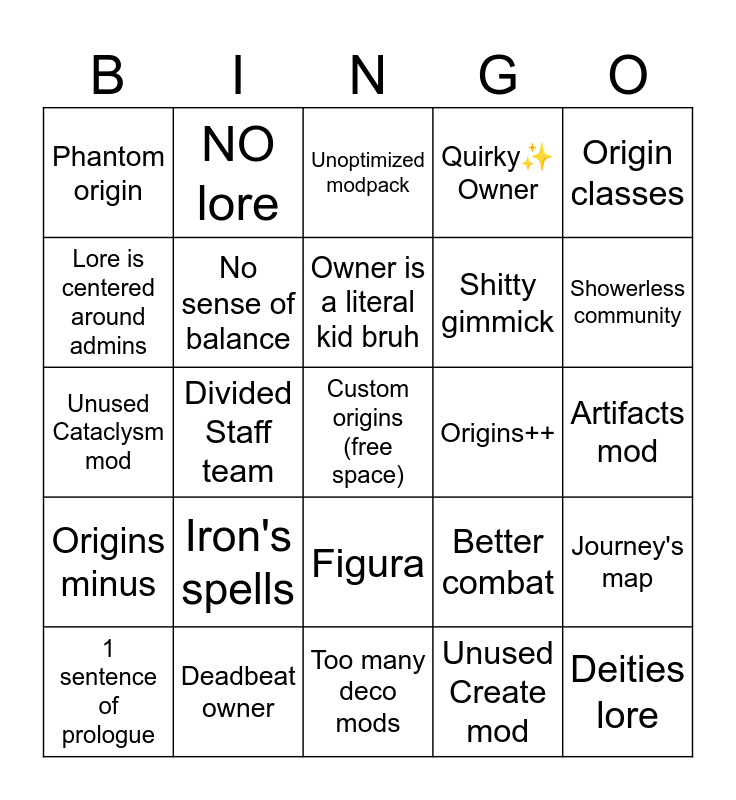 This bingo card has a free space and 45 words: Corruption lore, Deities lore, Isekai lore, 1 sentence of prologue, Biased staff team, Unused Create mod, Unoptimized modpack, kitchen sink, Origin classes, Deadbeat owner, Quirky✨ Owner, Origins++, Figura, Iron's spells, Simply swords, Too many deco mods, Medieval fantasy theme, Unused Cataclysm mod, "Chill" server, Showerless community, NO lore, 100 different YUNG mods, Too many keybinds, Phantom origin, When Dungeons Arise mod, Artifacts mod, No lootr, Inactive server, Better combat, Origins minus, Forge server, Journey's map, No means of transportation, Powercreep between mods, On their 457th reset, Divided Staff team, "We are not like other servers", No fun allowed, Actually.. good?, Owner is a literal kid bruh, Lore is centered around admins, Shitty gimmick, Modpack has no substance, No sense of balance and Server was released unfinished.