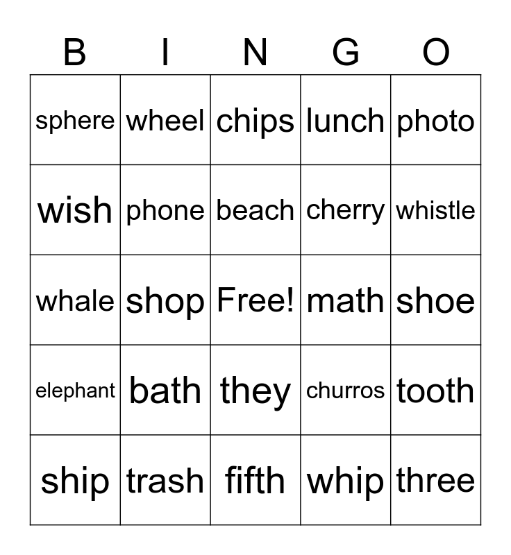 This bingo card has a free space and 24 words: ship, bath, beach, whip, photo, sphere, wheel, chips, math, shoe, whale, phone, churros, tooth, wish, trash, fifth, lunch, whistle, elephant, shop, they, cherry and three.