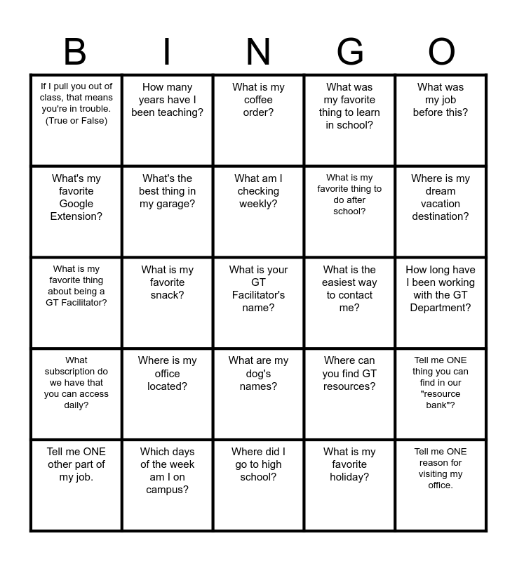 This bingo card has a free space and 24 words: Where is my office located?, Which days of the week am I on campus?, What am I checking weekly?, Tell me ONE other part of my job., What was my job before this?, If I pull you out of class, that means you're in trouble. (True or False), What's my favorite Google Extension?, How many years have I been teaching?, What is the easiest way to contact me?, What are my dog's names?, What is my favorite thing to do after school?, What is my favorite thing about being a GT Facilitator?, Where can you find GT resources?, Tell me ONE thing you can find in our "resource bank"?, What's the best thing in my garage?, What is my favorite holiday?, How long have I been working with the GT Department?, What is my coffee order?, Where is my dream vacation destination?, What is my favorite snack?, Tell me ONE reason for visiting my office., What subscription do we have that you can access daily?, What was my favorite thing to learn in school? and Where did I go to high school?.