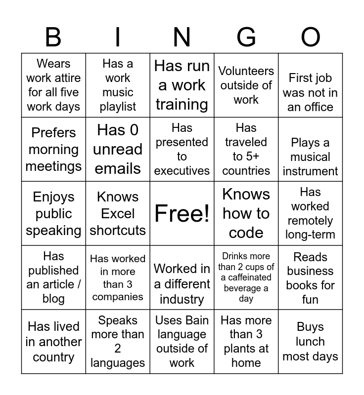 This bingo card has a free space and 24 words: Has worked in more than 3 companies, Speaks more than 2 languages, Has presented to executives, Has lived in another country, First job was not in an office, Wears work attire for all five work days, Prefers morning meetings, Has a work music playlist, Knows how to code, Worked in a different industry, Has traveled to 5+ countries, Enjoys public speaking, Drinks more than 2 cups of a caffeinated beverage a day, Reads business books for fun, Has 0 unread emails, Has more than 3 plants at home, Has worked remotely long-term, Has run a work training, Plays a musical instrument, Knows Excel shortcuts, Buys lunch most days, Has published an article / blog, Volunteers outside of work and Uses Bain language outside of work.