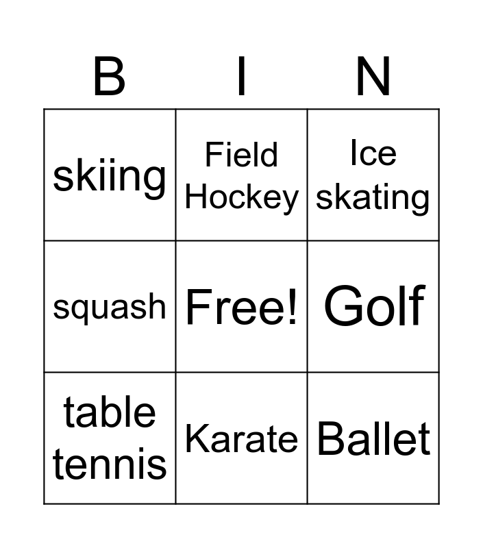 This bingo card has a free space and 12 words: Achery, Badminton, Ballet, Golf, Field Hockey, Ice skating, Karate, Sailing, skiing, squash, table tennis and vollleyball.