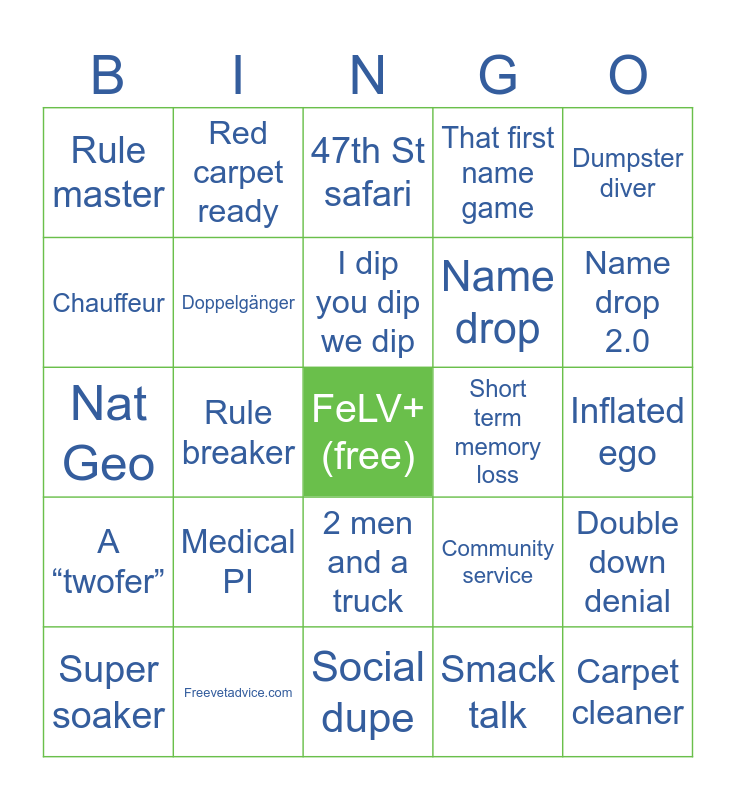 This bingo card has a free space and 42 words: PPE royalty, I dip you dip we dip, Pack rat, Medical PI, Smack talk, Double down denial, Carpet cleaner, Directionally challenged, 47th St safari, 2 men and a truck, Inflated ego, Name drop 2.0, Rule breaker, Dumpster diver, Oliver Twist, Community service, Collateral damage, Nat Geo, Shelter model, Red carpet ready, Chauffeur, I’m not IT, Feline FEMA, Rule master, Transfer trauma, Phone call marathon, Name drop, Schmear stamp, Scarf ‘n barf, Dolla dolla bills, Bell hop, A “twofer”, Doppelgänger, Social dupe, Free 95, Super soaker, Freevetadvice.com, Short term memory loss, The chosen one, Adopter BFF, That first name game and Parking lot party.