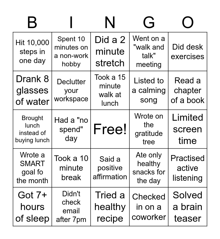 This bingo card has a free space and 24 words: Took a 10 minute break, Didn't check email after 7pm, Took a 15 minute walk at lunch, Got 7+ hours of sleep, Did desk exercises, Hit 10,000 steps in one day, Drank 8 glasses of water, Spent 10 minutes on a non-work hobby, Wrote on the gratitude tree, Said a positive affirmation, Listed to a calming song, Brought lunch instead of buying lunch, Ate only healthy snacks for the day, Practised active listening, Declutter your workspace, Checked in on a coworker, Limited screen time, Did a 2 minute stretch, Read a chapter of a book, Had a "no spend" day, Solved a brain teaser, Wrote a SMART goal fo the month, Went on a "walk and talk" meeting and Tried a healthy recipe.