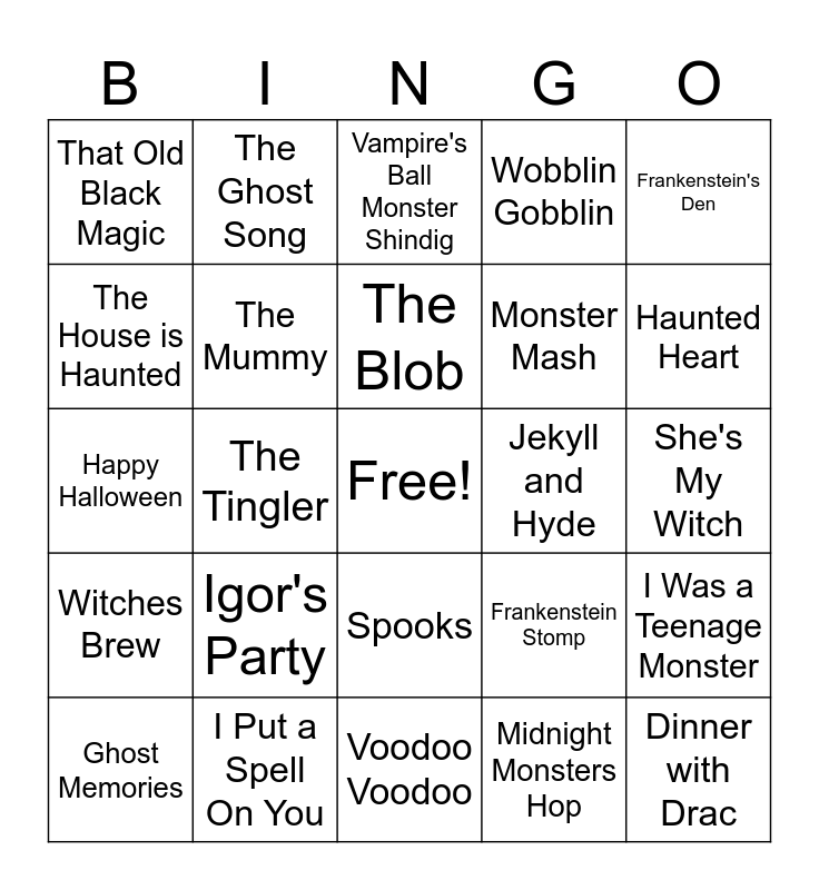 This bingo card has a free space and 28 words: The Purple People Eater, I Put a Spell On You, The Blob, Midnight Monsters Hop, Frankenstein's Den, That Old Black Magic, The Mummy, Voodoo Voodoo, Jekyll and Hyde, I Was a Teenage Monster, Happy Halloween, The Tingler, Frankenstein Stomp, Dinner with Drac, The House is Haunted, The Yodeling Ghost, Spooks, Wobblin Gobblin, Haunted Heart, Ghost Memories, The Ghost Song, Exploration in Terror, Monster Mash, She's My Witch, Witches Brew, Igor's Party, Vampire's Ball Monster Shindig and Graveyard Cha Cha.