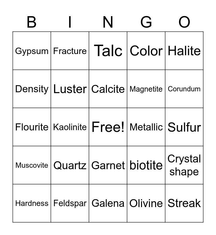 This bingo card has a free space and 24 words: Quartz, Feldspar, Calcite, Hardness, Halite, Gypsum, Density, Fracture, Metallic, Garnet, Magnetite, Flourite, biotite, Crystal shape, Luster, Olivine, Sulfur, Talc, Corundum, Kaolinite, Streak, Muscovite, Color and Galena.
