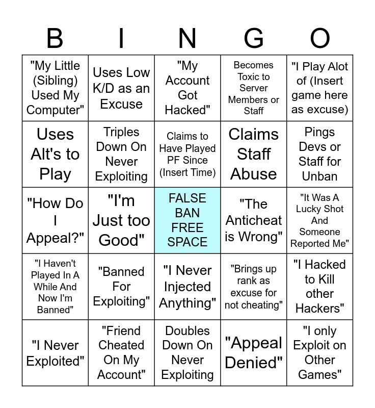 This bingo card has a free space and 24 words: "I Never Exploited", "Banned For Exploiting", Claims to Have Played PF Since (Insert Time), "Appeal Denied", "I Play Alot of (Insert game here as excuse), "My Little (Sibling) Used My Computer", Uses Low K/D as an Excuse, "My Account Got Hacked", "The Anticheat is Wrong", "It Was A Lucky Shot And Someone Reported Me", "How Do I Appeal?", Triples Down On Never Exploiting, "Brings up rank as excuse for not cheating", "I Hacked to Kill other Hackers", Uses Alt's to Play, "Friend Cheated On My Account", Doubles Down On Never Exploiting, Becomes Toxic to Server Members or Staff, Pings Devs or Staff for Unban, "I Haven't Played In A While And Now I'm Banned", "I'm Just too Good", "I Never Injected Anything", Claims Staff Abuse and "I only Exploit on Other Games".