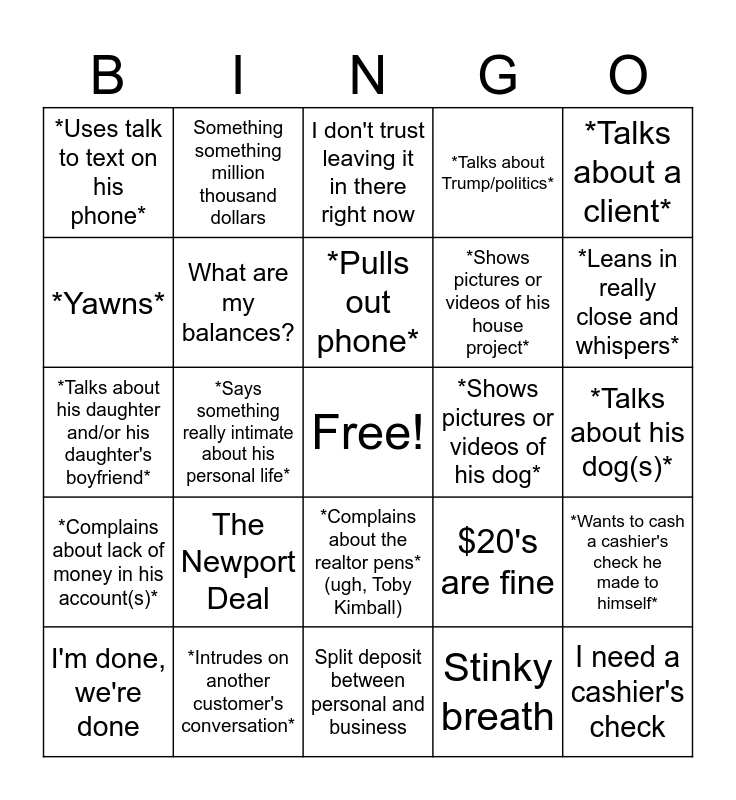 This bingo card has a free space and 24 words: The Newport Deal, *Intrudes on another customer's conversation*, *Pulls out phone*, I'm done, we're done, *Talks about a client*, *Uses talk to text on his phone*, *Yawns*, Something something million thousand dollars, *Shows pictures or videos of his dog*, *Complains about the realtor pens* (ugh, Toby Kimball), *Shows pictures or videos of his house project*, *Talks about his daughter and/or his daughter's boyfriend*, $20's are fine, *Wants to cash a cashier's check he made to himself*, What are my balances?, Stinky breath, *Talks about his dog(s)*, I don't trust leaving it in there right now, *Leans in really close and whispers*, *Says something really intimate about his personal life*, I need a cashier's check, *Complains about lack of money in his account(s)*, *Talks about Trump/politics* and Split deposit between personal and business.