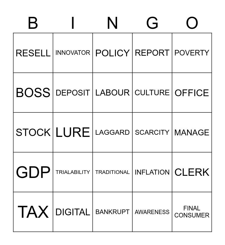 This bingo card has 25 words: TRIALABILITY, BANKRUPT, LABOUR, TAX, POVERTY, RESELL, BOSS, INNOVATOR, SCARCITY, TRADITIONAL, CULTURE, STOCK, INFLATION, CLERK, DEPOSIT, FINAL CONSUMER, MANAGE, POLICY, OFFICE, LURE, LAGGARD, DIGITAL, GDP, REPORT and AWARENESS.