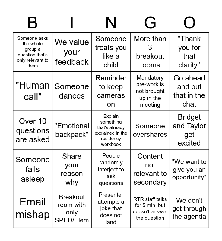 This bingo card has 25 words: Share your reason why, Presenter attempts a joke that does not land, Reminder to keep cameras on, Email mishap, "Thank you for that clarity", Someone asks the whole group a question that's only relevant to them, "Human call", We value your feedback, Someone overshares, People randomly interject to ask questions, Mandatory pre-work is not brought up in the meeting, Over 10 questions are asked, Content not relevant to secondary, "We want to give you an opportunity", Someone dances, We don't get through the agenda, Bridget and Taylor get excited, Someone treats you like a child, Go ahead and put that in the chat, "Emotional backpack", Explain something that's already explained in the residency workbook, Breakout room with only SPED/Elem, Someone falls asleep, More than 3 breakout rooms and RTR staff talks for 5 min, but doesn't answer the question.