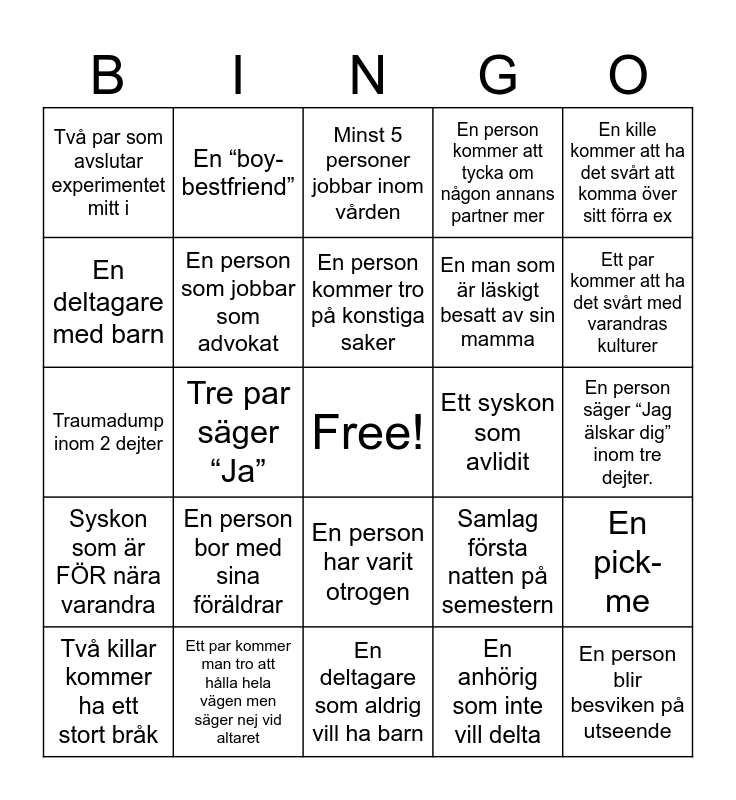 This bingo card has a free space and 24 words: En person bor med sina föräldrar, Ett par kommer man tro att hålla hela vägen men säger nej vid altaret, En person kommer tro på konstiga saker, Två killar kommer ha ett stort bråk, En kille kommer att ha det svårt att komma över sitt förra ex, Två par som avslutar experimentet mitt i, En deltagare med barn, En “boy-bestfriend”, Ett syskon som avlidit, En person har varit otrogen, En man som är läskigt besatt av sin mamma, Traumadump inom 2 dejter, Samlag första natten på semestern, En pick-me, En person som jobbar som advokat, En anhörig som inte vill delta, En person säger “Jag älskar dig” inom tre dejter., Minst 5 personer jobbar inom vården, Ett par kommer att ha det svårt med varandras kulturer, Tre par säger “Ja”, En person blir besviken på utseende, Syskon som är FÖR nära varandra, En person kommer att tycka om någon annans partner mer and En deltagare som aldrig vill ha barn.