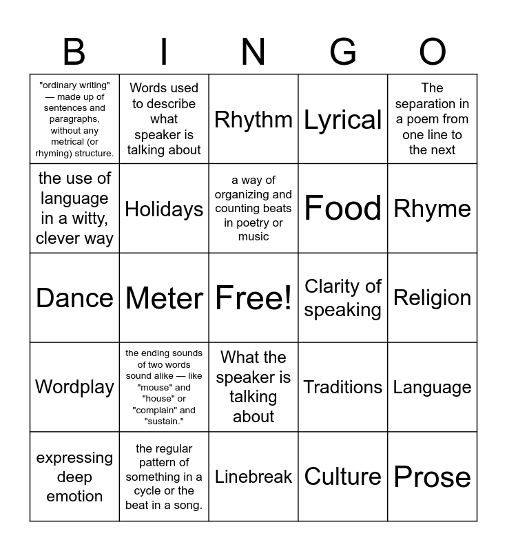 This bingo card has a free space and 24 words: the ending sounds of two words sound alike — like "mouse" and "house" or "complain" and "sustain.", the regular pattern of something in a cycle or the beat in a song., a way of organizing and counting beats in poetry or music, expressing deep emotion, The separation in a poem from one line to the next, "ordinary writing" — made up of sentences and paragraphs, without any metrical (or rhyming) structure., the use of language in a witty, clever way, Words used to describe what speaker is talking about, Clarity of speaking, What the speaker is talking about, Food, Dance, Traditions, Language, Holidays, Culture, Religion, Rhythm, Rhyme, Meter, Prose, Wordplay, Lyrical and Linebreak.