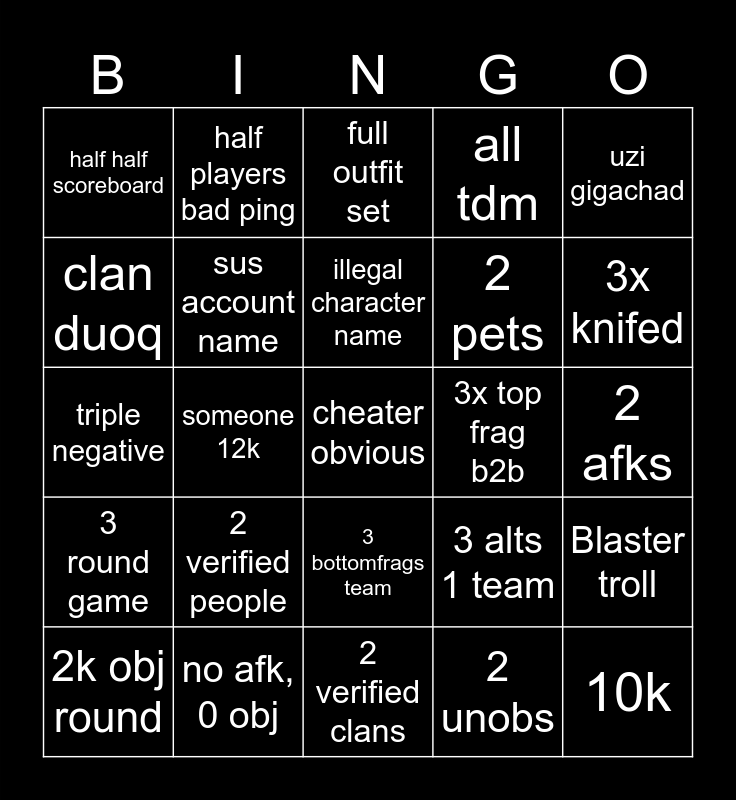 This bingo card has a free space and 24 words: 2 verified people, no afk, 0 obj, illegal character name, 2k obj round, uzi gigachad, half half scoreboard, clan duoq, half players bad ping, 3x top frag b2b, 3 bottomfrags team, 2 pets, triple negative, 3 alts 1 team, Blaster troll, sus account name, 2 unobs, 2 afks, full outfit set, 3x knifed, someone 12k, 10k, 3 round game, all tdm and 2 verified clans.