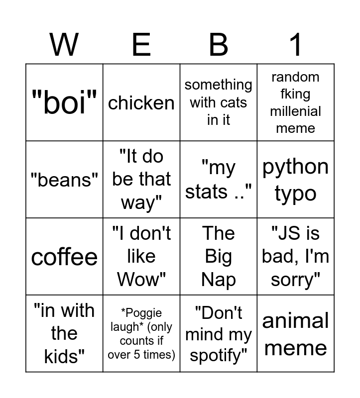 This bingo card has 19 words: The Big Nap, "Do you guys still …", something with cats in it, animal meme, "JS is bad, I'm sorry", "beans", "Don't mind my spotify", "boi", chicken, coffee, "I don't like Wow", "It do be that way", "my stats ..", *Poggie laugh* (only counts if over 5 times), "in with the kids", potato, random fking millenial meme, python typo and "you guys r lovely".
