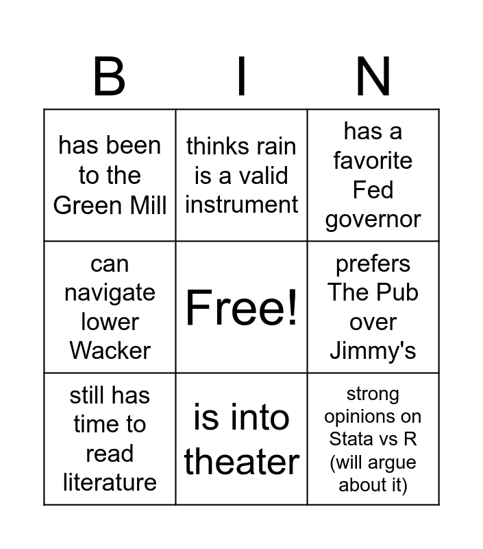 This bingo card has a free space and 32 words: thinks rain is a valid instrument, prefers Jimmy's over The Pub, prefers The Pub over Jimmy's, is into theater, does not hate Chicago winters, still has time to read literature, is up to date with One Piece, non-econ undergrad (or harder version, non-econ non-stem undergrad), thinks rain is a valid instrument, prefers Jimmy's over The Pub, prefers The Pub over Jimmy's, is into theater, does not hate Chicago winters, still has time to read literature, is up to date with One Piece, has worked for an IGO (World Bank, IMF, etc), will play in econ intramural soccer team, has been to an NBER conference, really liked / still likes Freakonomics, has a favorite L line and will defend it, has waited in line at Harold's Chicken, (secretly or openly) loves deep dish pizza, ketchup on hot dogs, on econ Twitter/BlueSky for the drama, strong opinions on Stata vs R (will argue about it), can navigate lower Wacker, has swum in the lake, has a favorite Fed governor, has been to the Green Mill, has attended a seminar just for the free food, plays Wordle/Connections during presentations and owns Nate Silver book.