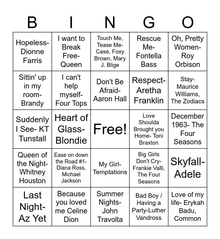 This bingo card has a free space and 62 words: I will always love you- Whitney Houston, Because you loved me Celine Dion, It must have been Love-Roxette, Queen of the Night- Whitney Houston, Footloose- Kenny Loggins, Unchained Melody- The Righteous Brothers, I can't help myself- Four Tops, Hound Dog- Elvis Presley, Respect- Aretha Franklin, Go your own way- Fleetwood Mac, Rescue Me- Fontella Bass, Just a Touch of love(Everyday)-C&C Music Factory, Sittin' up in my room- Brandy, Not Gon'Cry- Mary J. Blige, My funny Valentine- Chaka Khan, Hopeless- Dionne Farris, Love of my life- Erykah Badu, Common, Oh, Pretty Women- Roy Orbison, Is it Good to you- Teddy Riley, Tammy Lucas, Don't Be Afraid- Aaron Hall, Love Shoulda Brought you Home- Toni Braxton, Touch Me, Tease Me- Case, Foxy Brown, Mary J. Blige, Last Night- Az Yet, Bad Boy / Having a Party-Luther Vandross, Jungle Love- The Time, When Doves Cry- Prince, The Bird- The Time, Purple Rain- Prince, Skyfall- Adele, Stand By Me- Ben E. King, Running up that Hill- Kate Bush, Shallow- Lady Gaga, Bradley Cooper, Iris- The Goo Goo Dolls, Stayin Alive- Bee Gees, December 1963- The Four Seasons, I want to Break Free- Queen, Into the Groove- Madonna, Tender Love- Force M.D.'s, Heart of Glass- Blondie, Lead the Way- Mariah Carey, Suddenly I See- KT Tunstall, Our House- Madness, Ease on down the Road #1- Diana Ross, Michael Jackson, Be My Baby- The Ronettes, Stay- Maurice Williams, The Zodiacs, Big Girls Don't Cry- Frankie Valli, The Four Seasons, Do you love me- Contours, You Work for Me- Laura Mvula, Falling In Love- UB40, Nothing is Gonna Stop us Now- Starship, My Girl- Temptations, Summer Nights- John Travolta, Blue Moon- Sha Na Na, Eye of the Tiger- Survivor, You Make My Dreams- Daryl Hall & John Oates, Holding Out for a Hero- Bonnie Tyler, Everybody Wants to Rule the World- Tears for Fears, Hold On- Wilson Philips, Gangsta's Paradise- Coolio, L.V, Independent Women- Destiny's Child, Back To Black- Amy Winehouse and Rehab- Amy Winehouse.