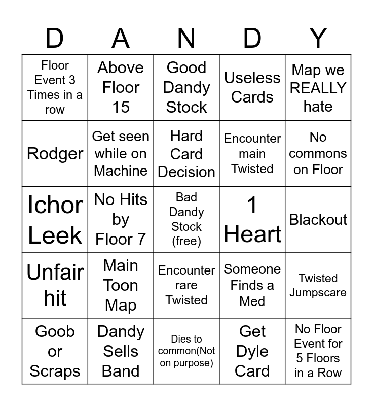 This bingo card has a free space and 24 words: Main Toon Map, Dandy Sells Band, Hard Card Decision, Goob or Scraps, Map we REALLY hate, Floor Event 3 Times in a row, Rodger, Above Floor 15, 1 Heart, Encounter rare Twisted, Encounter main Twisted, Ichor Leek, Someone Finds a Med, Twisted Jumpscare, Get seen while on Machine, Get Dyle Card, Blackout, Good Dandy Stock, No commons on Floor, No Hits by Floor 7, No Floor Event for 5 Floors in a Row, Unfair hit, Useless Cards and Dies to common(Not on purpose).