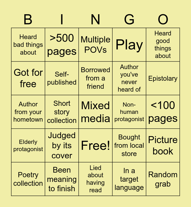 This bingo card has 26 words: Free!, In a target language, Borrowed from a friend, Been meaning to finish, Heard good things about, Heard bad things about, Got for free, >500 pages, <100 pages, Bought from local store, Author you've never heard of, Author from your hometown, Picture book, Poetry collection, Short story collection, Adapted into film, Play, Elderly protagonist, Multiple POVs, Mixed media, Epistolary, Lied about having read, Non-human protagonist, Judged by its cover, Self-published and Random grab.