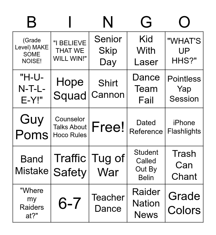 This bingo card has a free space and 24 words: Traffic Safety, 6-7, Shirt Cannon, "Where my Raiders at?", "WHAT'S UP HHS?", (Grade Level) MAKE SOME NOISE!, "H-U-N-T-L-E-Y!", "I BELIEVE THAT WE WILL WIN!", Dated Reference, Tug of War, Dance Team Fail, Guy Poms, Student Called Out By Belin, Trash Can Chant, Hope Squad, Raider Nation News, iPhone Flashlights, Senior Skip Day, Pointless Yap Session, Counselor Talks About Hoco Rules, Grade Colors, Band Mistake, Kid With Laser and Teacher Dance.
