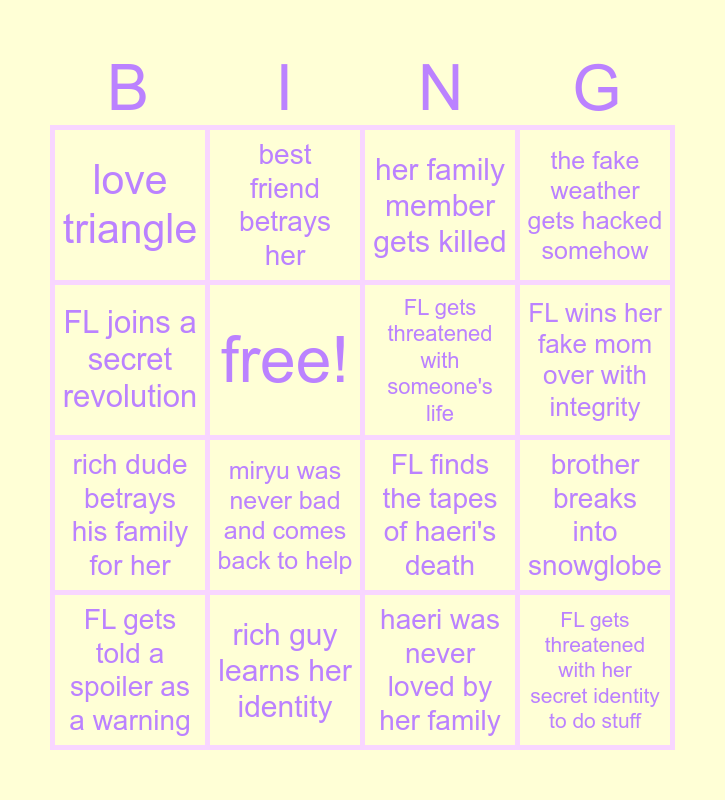 This bingo card has 16 words: rich guy learns her identity, brother breaks into snowglobe, her family member gets killed, love triangle, rich dude betrays his family for her, best friend betrays her, FL finds the tapes of haeri's death, haeri was never loved by her family, FL joins a secret revolution, free!, FL gets told a spoiler as a warning, the fake weather gets hacked somehow, miryu was never bad and comes back to help, FL wins her fake mom over with integrity, FL gets threatened with someone's life and FL gets threatened with her secret identity to do stuff.