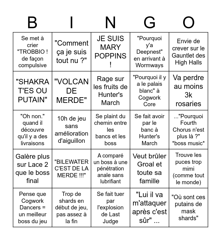 This bingo card has a free space and 24 words: "BILEWATER C'EST DE LA MERDE !!!", Trop de shards en début de jeu, pas assez à la fin, Rage sur les fruits de Hunter's March, Pense que Cogwork Dancers = un meilleur boss du jeu, Envie de crever sur le Gauntlet des High Halls, Se met à crier "TROBBIO ! de façon compulsive, "SHAKRA T'ES OU PUTAIN", "Comment ça je suis tout nu ?", Se fait avoir par le banc à Hunter's March, A comparé un boss à une pénétration anale sans lubrifiant, "Pourquoi il y a le palais blanc" à Cogwork Core, "Oh non." quand il découvre qu'il y a des livraisons, Veut brûler Groal et toute sa famille, Trouve les puces trop mimi (comme tout le monde), "VOLCAN DE MERDE", "Lui il va m'attaquer après c'est sûr" ..., ..."Pourquoi Fourth Chorus n'est plus là ?" *boss music*, JE SUIS MARY POPPINS !, Va perdre au moins 3k rosaries, 10h de jeu sans amélioration d'aiguillon, "Où sont ces putains de mask shards", Galère plus sur Lace 2 que le boss final, "Pourquoi y'a Deepnest" en arrivant à Wormways and Se fait tuer par l'explosion de Last Judge.