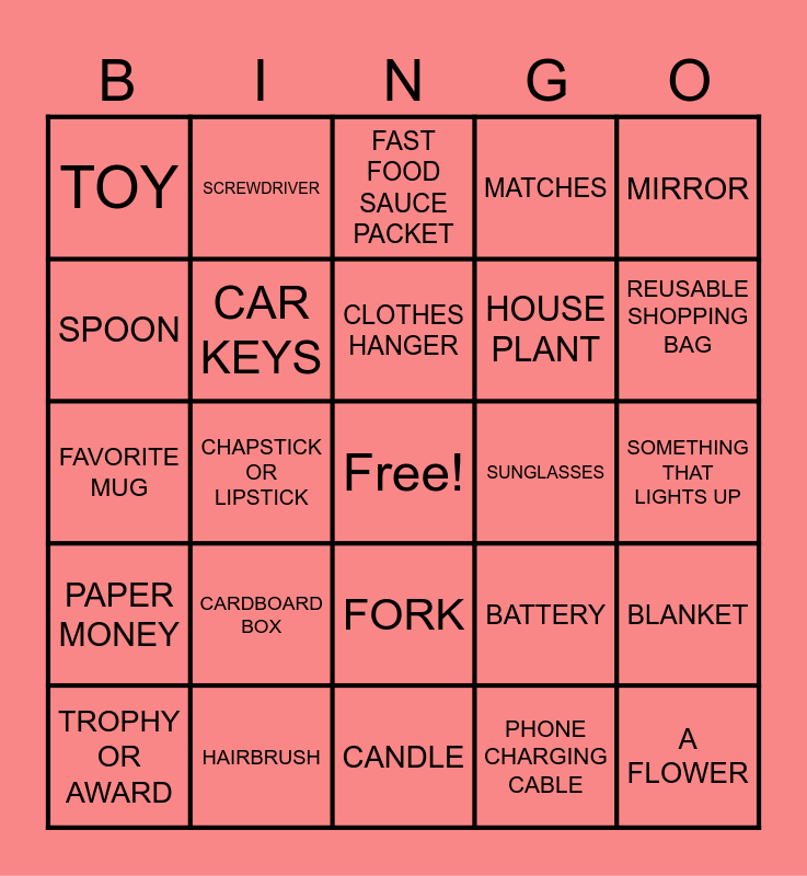 This bingo card has a free space and 24 words: CARDBOARD BOX, HAIRBRUSH, CLOTHES HANGER, TROPHY OR AWARD, MIRROR, TOY, SPOON, SCREWDRIVER, SUNGLASSES, FORK, HOUSE PLANT, FAVORITE MUG, BATTERY, BLANKET, CAR KEYS, PHONE CHARGING CABLE, SOMETHING THAT LIGHTS UP, FAST FOOD SAUCE PACKET, REUSABLE SHOPPING BAG, CHAPSTICK OR LIPSTICK, A FLOWER, PAPER MONEY, MATCHES and CANDLE.
