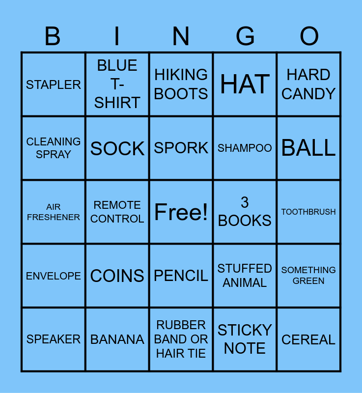 This bingo card has a free space and 24 words: COINS, BANANA, SPORK, SPEAKER, HARD CANDY, STAPLER, CLEANING SPRAY, BLUE T-SHIRT, 3 BOOKS, PENCIL, SHAMPOO, AIR FRESHENER, STUFFED ANIMAL, SOMETHING GREEN, SOCK, STICKY NOTE, TOOTHBRUSH, HIKING BOOTS, BALL, REMOTE CONTROL, CEREAL, ENVELOPE, HAT and RUBBER BAND OR HAIR TIE.