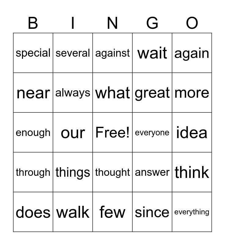 This bingo card has a free space and 24 words: things, walk, what, does, again, special, near, several, everyone, thought, great, enough, answer, think, always, since, idea, against, more, our, everything, through, wait and few.