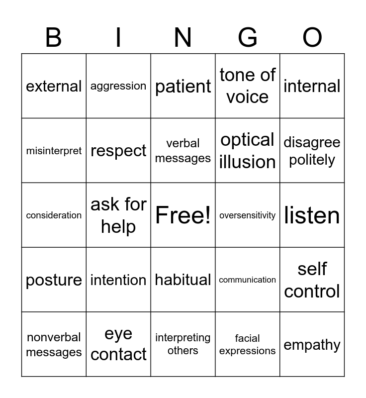 This bingo card has a free space and 25 words: intention, interpreting others, verbal messages, nonverbal messages, internal, external, misinterpret, aggression, oversensitivity, habitual, optical illusion, consideration, communication, self control, respect, accept differences, listen, patient, disagree politely, ask for help, empathy, eye contact, posture, tone of voice and facial expressions.