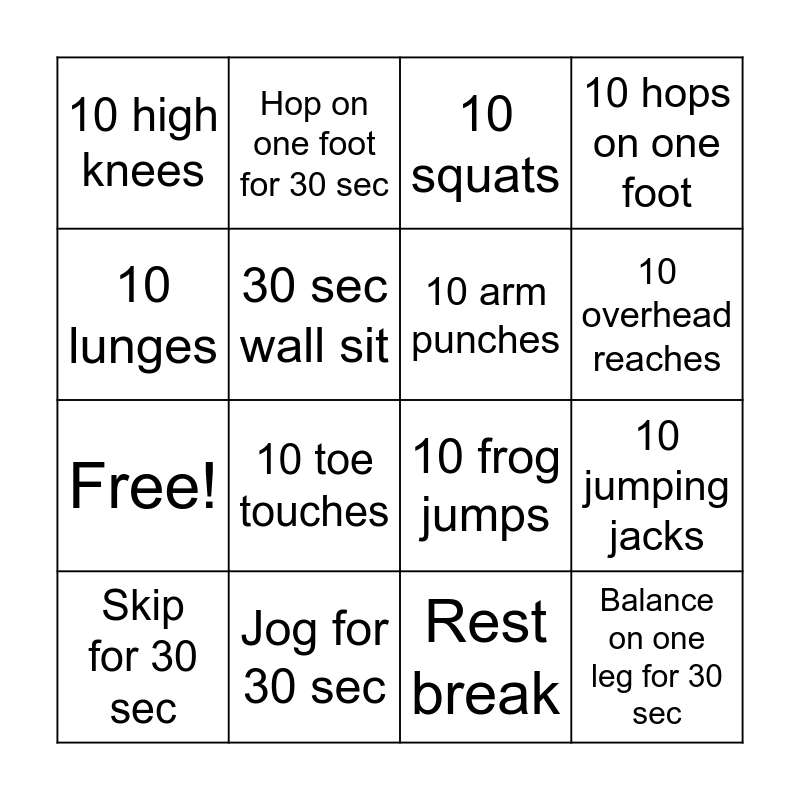 This bingo card has 20 words: 10 jumping jacks, 10 marches, 10 squats, 10 arm circles, Skip for 30 sec, 10 lunges, Jog for 30 sec, 10 high knees, Free!, Hop on one foot for 30 sec, 10 toe touches, 10 frog jumps, 30 sec wall sit, Balance on one leg for 30 sec, 10 arm punches, 10 side bends, 10 overhead reaches, 10 hops on one foot, Rest break and 10 of your choice.