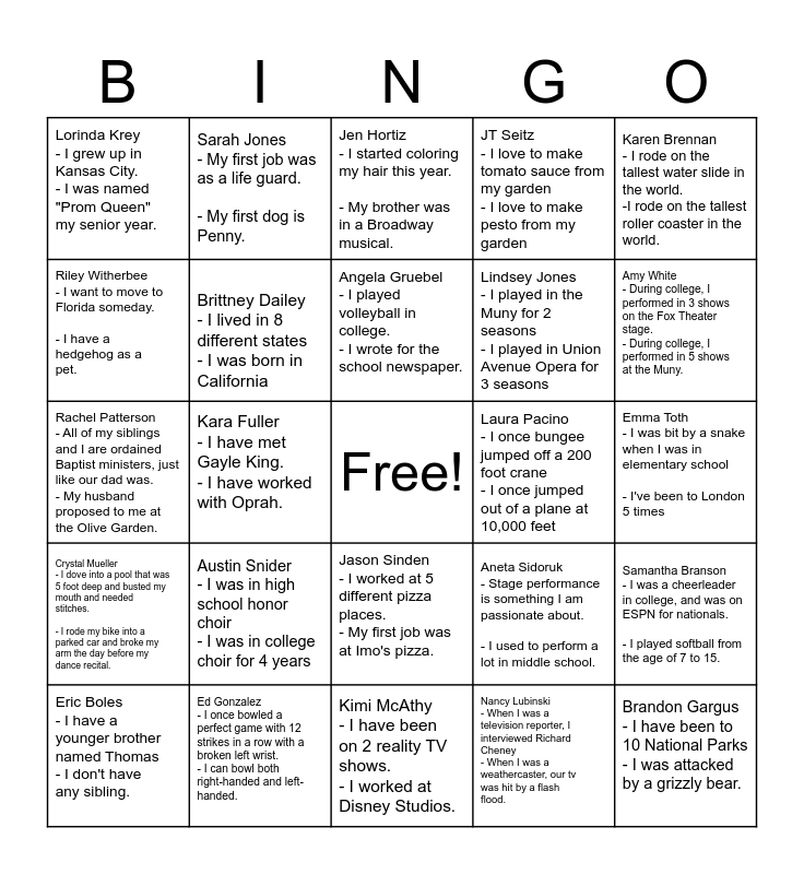 This bingo card has a free space and 26 words: Jason Sinden - I worked at 5 different pizza places. - My first job was at Imo's pizza., Nancy Lubinski - When I was a television reporter, I interviewed Richard Cheney - When I was a weathercaster, our tv was hit by a flash flood., Angela Gruebel - I played volleyball in college. - I wrote for the school newspaper., Ed Gonzalez - I once bowled a perfect game with 12 strikes in a row with a broken left wrist. - I can bowl both right-handed and left-handed., Karen Brennan - I rode on the tallest water slide in the world. -I rode on the tallest roller coaster in the world., Lorinda Krey - I grew up in Kansas City. - I was named "Prom Queen" my senior year., Riley Witherbee - I want to move to Florida someday. - I have a hedgehog as a pet., Sarah Jones - My first job was as a life guard. - My first dog is Penny., Emma Toth - I was bit by a snake when I was in elementary school - I've been to London 5 times, Aneta Sidoruk - Stage performance is something I am passionate about. - I used to perform a lot in middle school., Lindsey Jones - I played in the Muny for 2 seasons - I played in Union Avenue Opera for 3 seasons, Rachel Patterson - All of my siblings and I are ordained Baptist ministers, just like our dad was. - My husband proposed to me at the Olive Garden., Samantha Branson - I was a cheerleader in college, and was on ESPN for nationals. - I played softball from the age of 7 to 15., Eric Boles - I have a younger brother named Thomas - I don't have any sibling., Kara Fuller - I have met Gayle King. - I have worked with Oprah., Lauren Grant - I went to London for the Taylor Swift Eras Tour. - I have a brother who has the same first name as my last name., JT Seitz - I love to make tomato sauce from my garden - I love to make pesto from my garden, Crystal Mueller - I dove into a pool that was 5 foot deep and busted my mouth and needed stitches. - I rode my bike into a parked car and broke my arm the day before my dance recital., Jen Hortiz - I started coloring my hair this year. - My brother was in a Broadway musical., Brandon Gargus - I have been to 10 National Parks - I was attacked by a grizzly bear., Amy White - During college, I performed in 3 shows on the Fox Theater stage. - During college, I performed in 5 shows at the Muny., Kimi McAthy - I have been on 2 reality TV shows. - I worked at Disney Studios., Laura Pacino - I once bungee jumped off a 200 foot crane - I once jumped out of a plane at 10,000 feet, Austin Snider - I was in high school honor choir - I was in college choir for 4 years, Brittney Dailey - I lived in 8 different states - I was born in California and Jeanne Flowers - Before I was 18, I lived in five different cities. - Before I was 18, I lived in 2 different countries..
