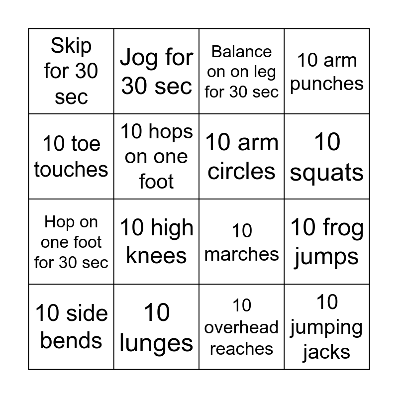 This bingo card has 16 words: 10 side bends, 10 lunges, Balance on on leg for 30 sec, 10 arm punches, 10 toe touches, Jog for 30 sec, 10 marches, 10 frog jumps, Skip for 30 sec, 10 hops on one foot, 10 overhead reaches, 10 squats, Hop on one foot for 30 sec, 10 high knees, 10 arm circles and 10 jumping jacks.