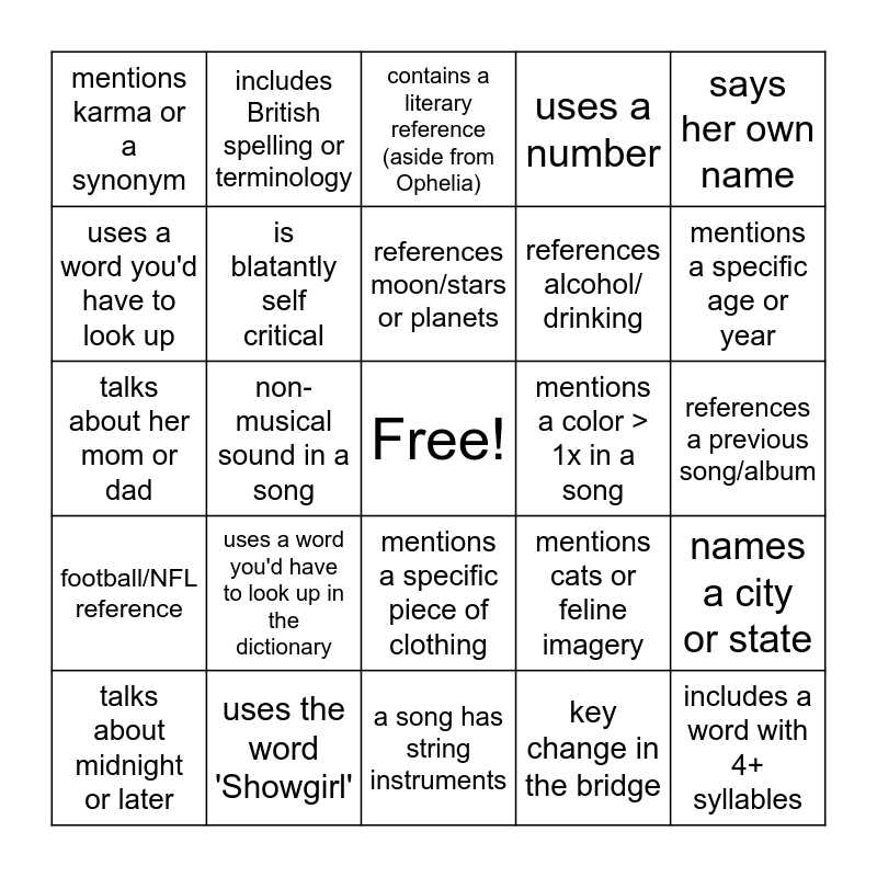 This bingo card has a free space and 24 words: uses a word you'd have to look up in the dictionary, uses the word 'Showgirl', references moon/stars or planets, talks about midnight or later, says her own name, mentions karma or a synonym, uses a word you'd have to look up, includes British spelling or terminology, mentions a color > 1x in a song, mentions a specific piece of clothing, references alcohol/ drinking, talks about her mom or dad, mentions cats or feline imagery, names a city or state, is blatantly self critical, key change in the bridge, references a previous song/album, contains a literary reference (aside from Ophelia), mentions a specific age or year, non-musical sound in a song, includes a word with 4+ syllables, football/NFL reference, uses a number and a song has string instruments.