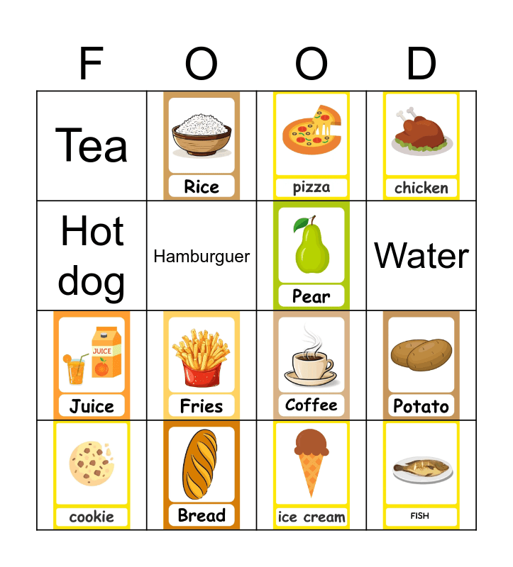 This bingo card has 18 images and 7 words: Eggs, Cake, Water, Spaghetti, Hot dog, Tea and Hamburguer.