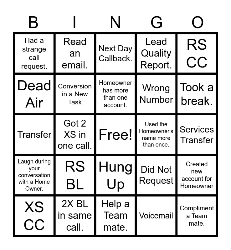 This bingo card has a free space and 29 words: XS CC, Said "Good Morning", Got 2 XS in one call., Customer gave me a compliment, Had a strange call request., Next Day Callback., Conversion in a New Task, RS BL, Used the Homeowner's name more than once., 2X BL in same call., Services Transfer, Compliment a Team mate., Help a Team mate., Voicemail, Took a break., Smile when I answer the call., Hung Up, Laugh during your conversation with a Home Owner., RS CC, Transfer, Did Not Request, Do Not Call List, Wrong Number, Dead Air, Lead Quality Report., Read an email., Created new account for Homeowner, Homeowner has more than one account. and Homeowner's dog barking..