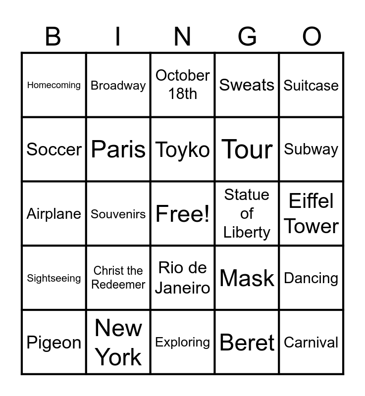 This bingo card has a free space and 41 words: Airport, Airplane, Traveling, Paris, New York, Rio de Janeiro, Toyko, Night, Suitcase, Sightseeing, Souvenirs, Sweats, Carnival, Eiffel Tower, Statue of Liberty, Christ the Redeemer, Lights, Homecoming, Ticket, October 18th, Dancing, Music, Exploring, Tour, Journey, Navigate, Beret, Metro, Subway, Perfume, Times Square, Broadway, Pigeon, Beach, Mask, Soccer, Cherry Blossom, Train, Station, Mount Fuji and Karaoke.