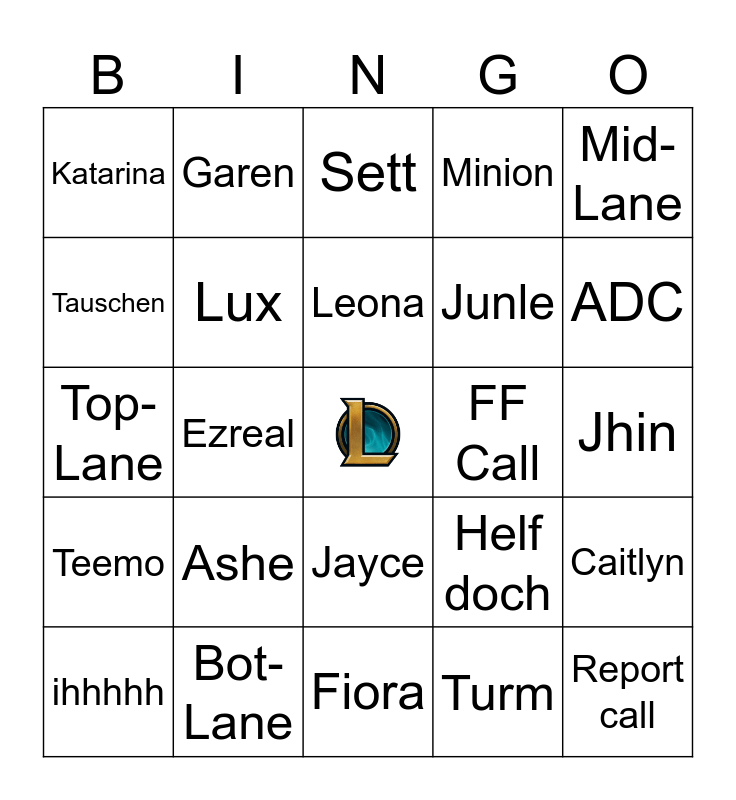 This bingo card has a free space and 24 words: Ashe, Bot-Lane, Leona, ihhhhh, Mid-Lane, Katarina, Tauschen, Garen, FF Call, Jayce, Junle, Top-Lane, Helf doch, Caitlyn, Lux, Turm, Jhin, Sett, ADC, Ezreal, Report call, Teemo, Minion and Fiora.