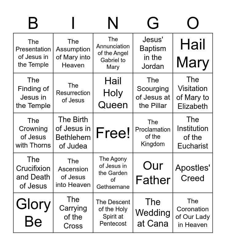 This bingo card has a free space and 25 words: The Ascension of Jesus into Heaven, The Descent of the Holy Spirit at Pentecost, Hail Holy Queen, Glory Be, Hail Mary, The Presentation of Jesus in the Temple, The Finding of Jesus in the Temple, The Assumption of Mary into Heaven, The Proclamation of the Kingdom, The Agony of Jesus in the Garden of Gethsemane, The Scourging of Jesus at the Pillar, The Crowning of Jesus with Thorns, Our Father, Apostles' Creed, The Resurrection of Jesus, The Transfiguration, The Institution of the Eucharist, The Annunciation of the Angel Gabriel to Mary, The Visitation of Mary to Elizabeth, The Birth of Jesus in Bethlehem of Judea, The Coronation of Our Lady in Heaven, The Carrying of the Cross, The Crucifixion and Death of Jesus, Jesus' Baptism in the Jordan and The Wedding at Cana.