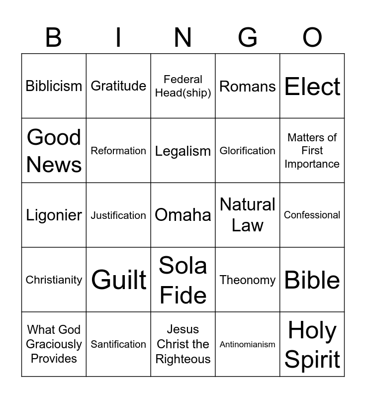 This bingo card has a free space and 49 words: Glawspel, Holy Spirit, Do this and Live, Jesus Christ the Righteous, Guilt, Grace, Gratitude, Gladiator, Good News, Pactum, Reformation, Romans, Bible, Theonomy, 2 Kingdom, Covenant, Legalism, Natural Law, Dispensationalism, Elect, Justification, Antinomianism, Biblicism, Glorification, No Compromise, Matters of First Importance, What God Graciously Provides, Sovereignty, Sola Fide, Christianity, John Owens, J V Fesko, Gnostic(ism), Heresy, Santification, Active Obedience, Passive Obedience, Calvin(ism), Confessional, 1689, Machen, Zionism, Suffering, Christological, Ligonier, Federal Head(ship), Types & Shadows, Perfectly, Perpetually, Personally and Millennial.