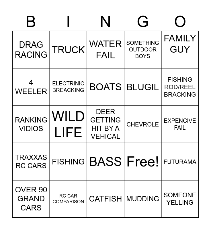 This bingo card has 25 words: FISHING, CATFISH, BOATS, OVER 90 GRAND CARS, FAMILY GUY, DRAG RACING, 4 WEELER, TRUCK, CHEVROLE, BASS, BLUGIL, RANKING VIDIOS, Free!, FUTURAMA, ELECTRINIC BREACKING, SOMEONE YELLING, EXPENCIVE FAIL, WATER FAIL, FISHING ROD/REEL BRACKING, WILD LIFE, DEER GETTING HIT BY A VEHICAL, RC CAR COMPARISON, TRAXXAS RC CARS, SOMETHING OUTDOOR BOYS and MUDDING.