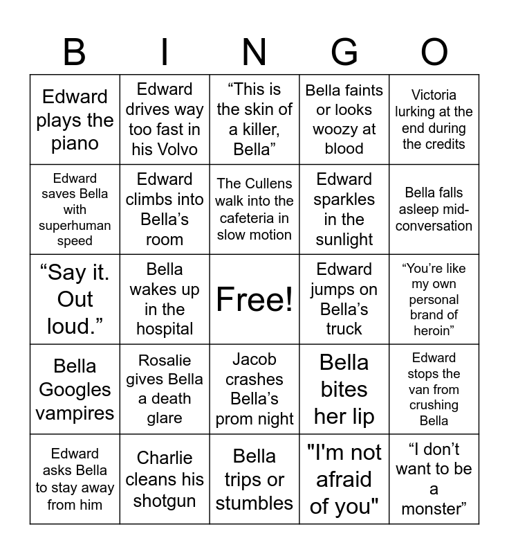 This bingo card has a free space and 27 words: Bella bites her lip, “Hold on tight, spider monkey”, Edward sparkles in the sunlight, Bella trips or stumbles, Edward saves Bella with superhuman speed, “This is the skin of a killer, Bella”, Edward drives way too fast in his Volvo, Bella Googles vampires, Edward jumps on Bella’s truck, Edward stops the van from crushing Bella, “Say it. Out loud.”, Bella faints or looks woozy at blood, Edward asks Bella to stay away from him, Charlie cleans his shotgun, Bella falls asleep mid-conversation, Bella breathes really heavily, Edward climbs into Bella’s room, The Cullens walk into the cafeteria in slow motion, Rosalie gives Bella a death glare, Edward plays the piano, “You’re like my own personal brand of heroin”, "I'm not afraid of you", Bella wakes up in the hospital, “I don’t want to be a monster”, Jacob crashes Bella’s prom night, Victoria lurking at the end during the credits and Someone mentions the word “vampire” directly.