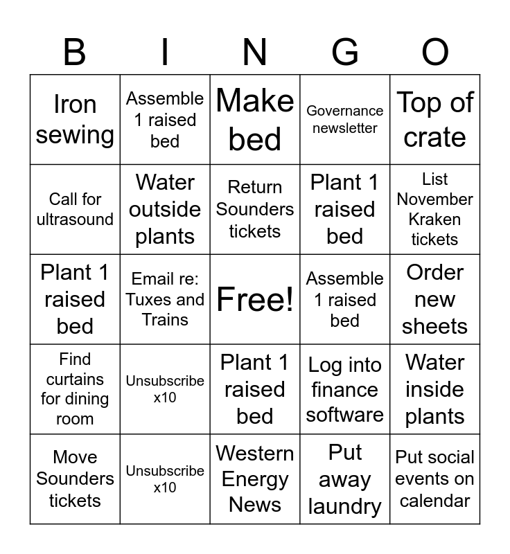 This bingo card has a free space and 24 words: Unsubscribe x10, Unsubscribe x10, Return Sounders tickets, Move Sounders tickets, Top of crate, Iron sewing, Call for ultrasound, Assemble 1 raised bed, Assemble 1 raised bed, Plant 1 raised bed, Plant 1 raised bed, Plant 1 raised bed, Log into finance software, Water inside plants, Water outside plants, Put away laundry, Order new sheets, Make bed, List November Kraken tickets, Email re: Tuxes and Trains, Put social events on calendar, Find curtains for dining room, Governance newsletter and Western Energy News.