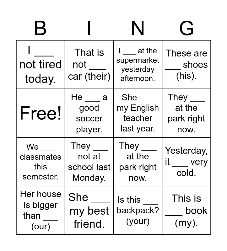 This bingo card has 16 words: She ___ my best friend., Yesterday, it ___ very cold., I ___ at the supermarket yesterday afternoon., I ___ not tired today., We ___ classmates this semester., That is not ___ car (their), They ___ at the park right now., Is this ___ backpack? (your), Free!, He ___ a good soccer player., Her house is bigger than ___ (our), These are ___ shoes (his)., They ___ not at school last Monday., They ___ at the park right now., She ___ my English teacher last year. and This is ___ book (my)..