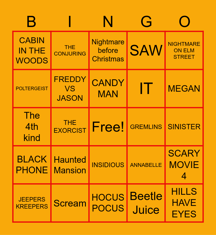 This bingo card has a free space and 30 words: Scream, Halloween, THE EXORCIST, TEXAS CHAIN SAW MASSACRE, CABIN IN THE WOODS, Nightmare before Christmas, FREDDY VS JASON, INSIDIOUS, GREMLINS, HOCUS POCUS, SINISTER, HILLS HAVE EYES, Beetle Juice, CARRIE, MEGAN, HUNTING IN CT, ANNABELLE, BLACK PHONE, Haunted Mansion, NIGHTMARE ON ELM STREET, The 4th kind, AMMITYVILLE HORROR, THE CONJURING, IT, POLTERGEIST, SAW, SCARY MOVIE 4, JEEPERS KREEPERS, CANDY MAN and FRIDAY 13TH.